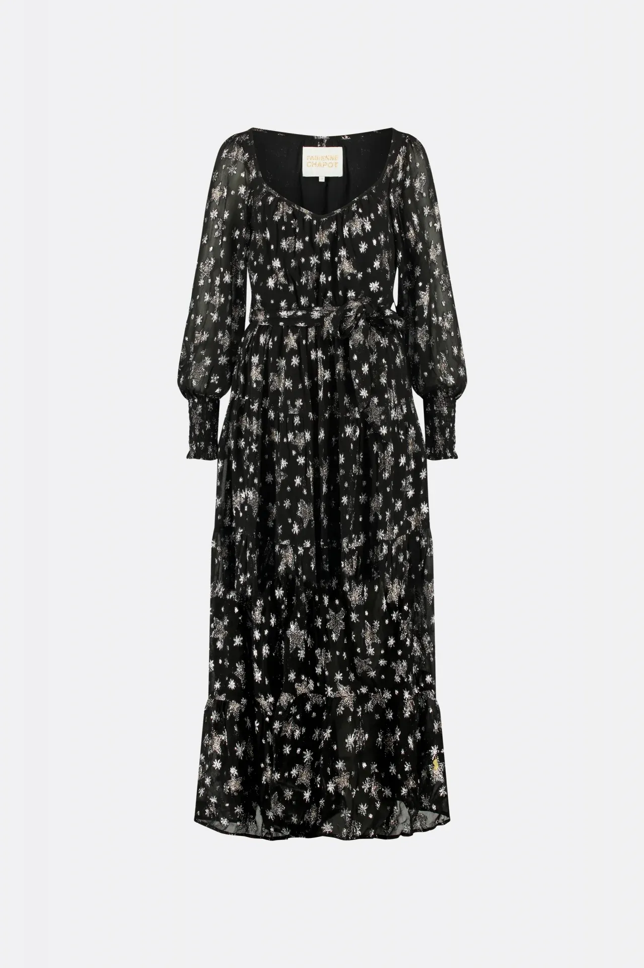 Laissez-vous séduire par la robe Folie signée Fabienne Chapot, une pièce phare à l’élégance bohème et au charme rock-chic. Cette robe longue noire dévoile un superbe imprimé d’étoiles dorées et argentées qui apportent une touche d’éclat subtile. Son décolleté arrondi flatte le port de tête, tandis que sa coupe fluide caresse la silhouette avec légèreté.