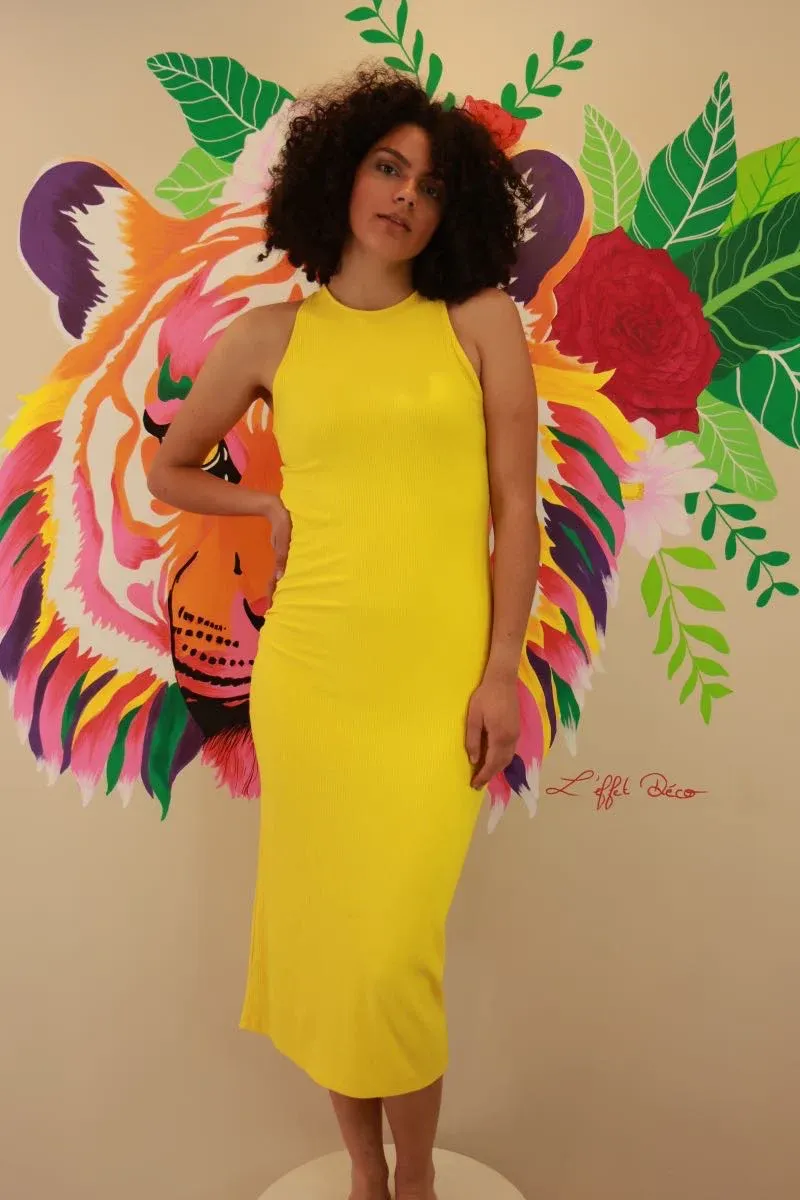 Un soleil dans votre dressing ? On dit OUI ! Cette robe midi jaune pétillant est une vraie pépite de seconde main. Avec sa coupe près du corps et son tissu côtelé, elle épouse les courbes avec style tout en restant ultra-confort. Le détail qui tue ? Son dos nu croisé, audacieux et terriblement flatteur.