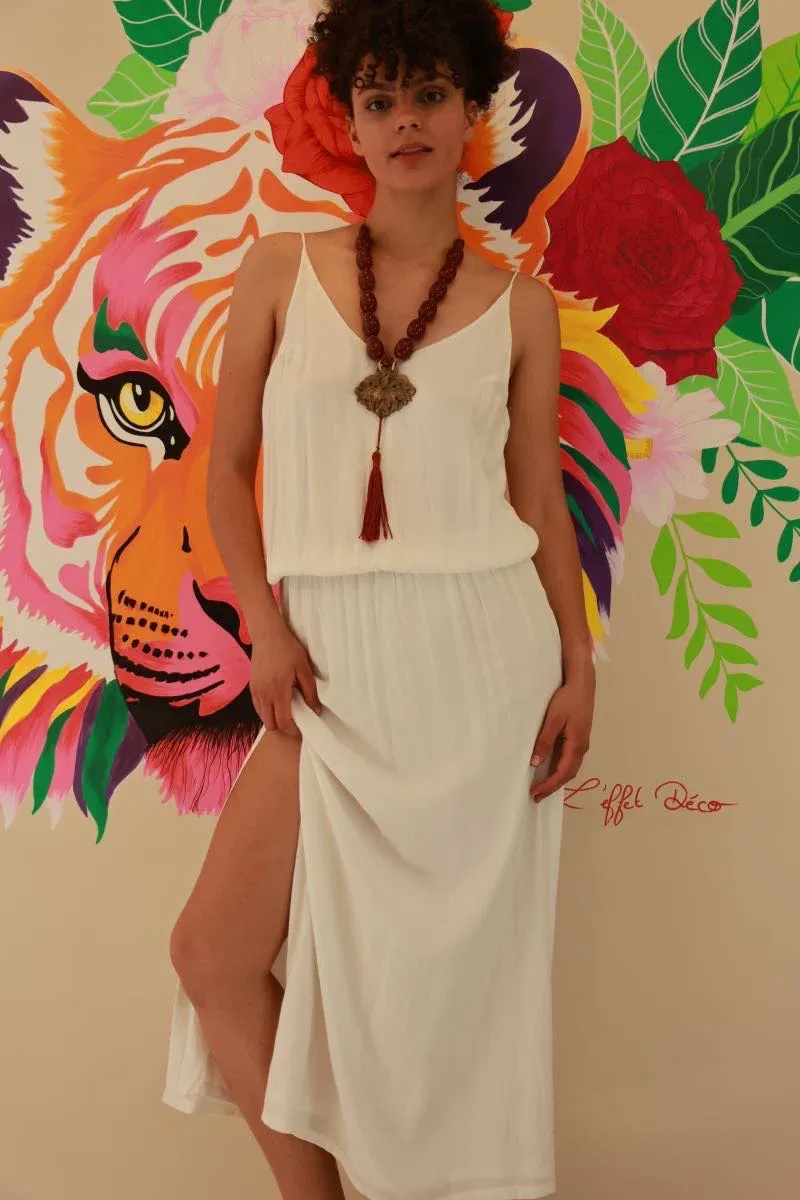 Confectionnée en viscose fluide, elle offre un tombé impeccable et une sensation de douceur sur la peau. Sa coupe esprit dos-nu avec fines bretelles et joli décolleté en V devant et derrière, met en valeur la silhouette avec une élégance naturelle. La taille élastiquée crée un joli drapé, tandis que la fente sur la jambe ajoute une touche féminine et un brin audacieuse.