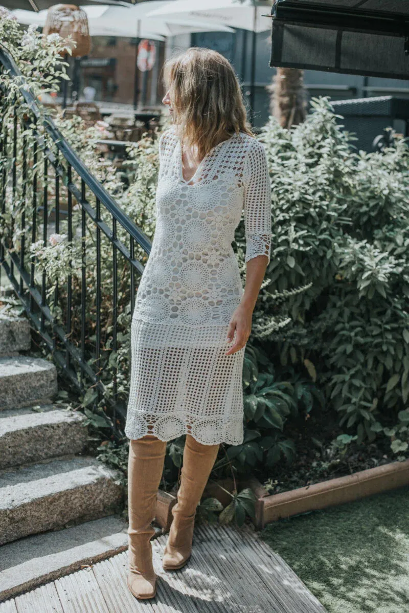 Une robe blanche en crochet hyper glamour. Silhouette de naïade assurée pour un p’tit repas en amoureux ou pour flâner EN VILLE où à la campagagne. Une robe parfaite car vous êtes parfaite.