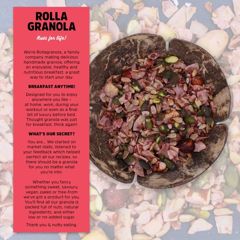 Ingredients: Raspberries, Flaked Coconut (24%), Brazil Nuts, Pumpkin Seeds (14%), Sunflower Protein (‘Sunflower Hack’), Sunflower Seeds, Hazelnuts, Almonds, Flax, Walnuts, Apple, Avocado Oil, Stevia