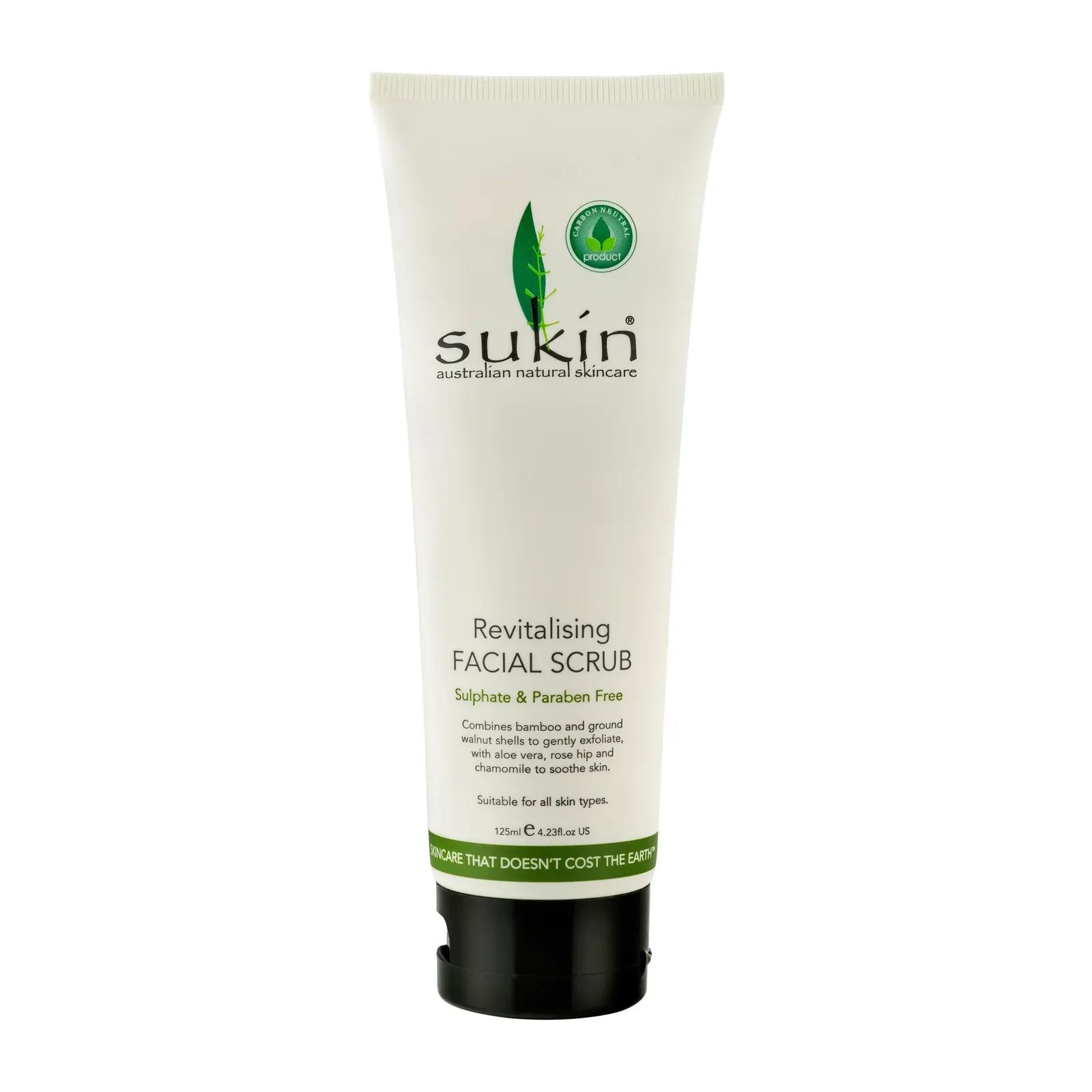 Sukin Revitalising Facial Scrub uses non-abrasive, micro particles of bamboo extract and ground walnut shells to remove dirt and impurities leaving clean, radiant skin. Aloe vera and chamomile work to soothe skin and rose hip, jojoba and sesame replenish and protect the skin’s moisture barrier.