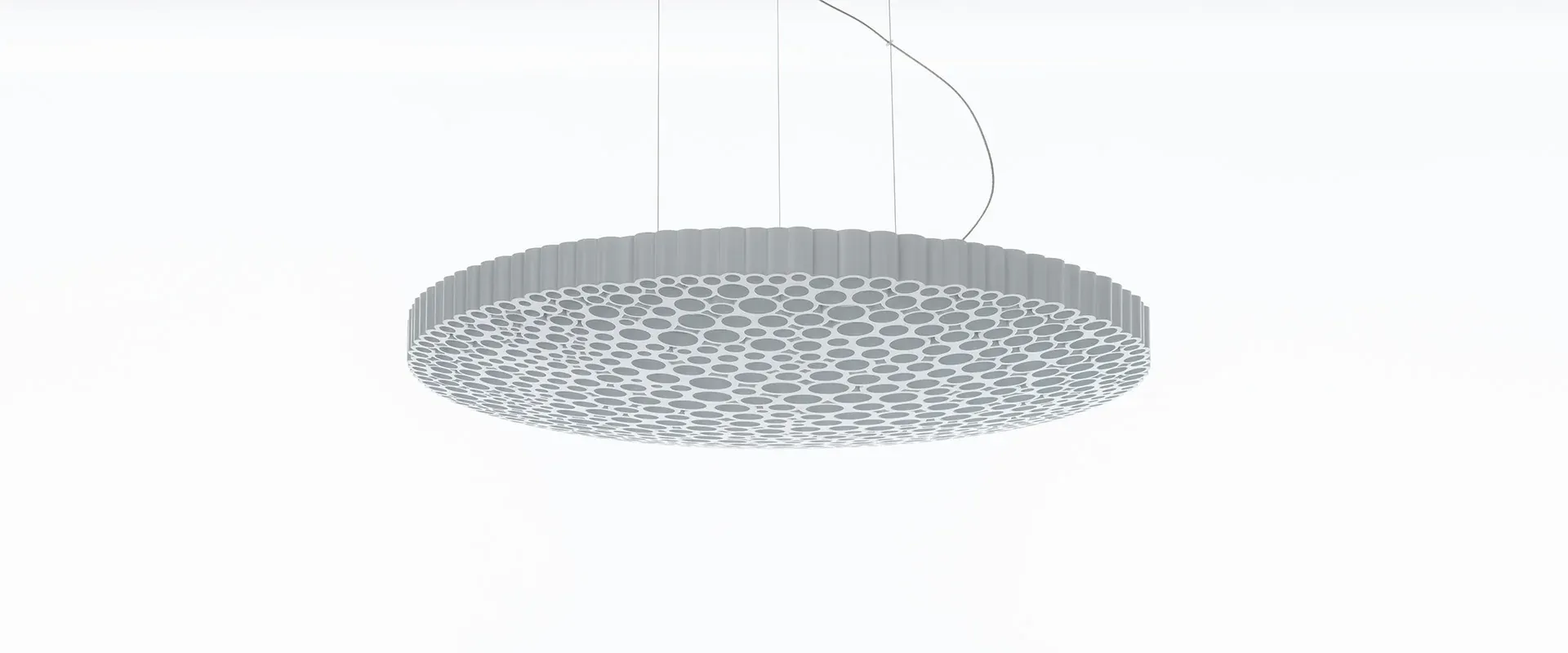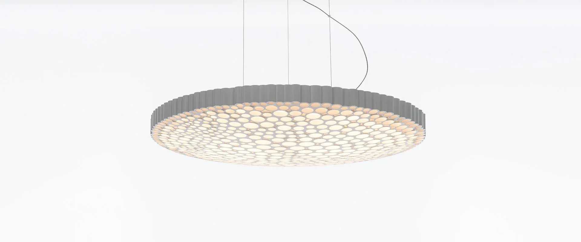 La grille en nid d’abeille unique de Calipso a été générée en introduisant une photo de la lune dans un algorithme basé sur l’image trouvé sur un ordinateur apparemment éteint. La forme fractale qui en résulte, une géométrie impure qui affiche la beauté irrégulière de la nature, est construite à partir d’un nid d’abeilles organique composé de tubes de différents diamètres, apparemment disposés selon une géométrie aléatoire. Ce nid d’abeille caractérise la lampe à la fois esthétiquement et optiquement : non seulement il est visuellement agréable, mais il offre également une émission de lumière uniforme et confortable. Le résultat est un objet lumineux hautement émotionnel qui allie intelligence optique et esthétique. Produit parfaitement positionné à mi-chemin entre un usage domestique et professionnel, Calipso est adapté à une variété d’applications – exprimant l’approche traditionnelle d’Artemide visant à fournir un éclairage de haute performance avec une expressivité unique et émotionnelle.