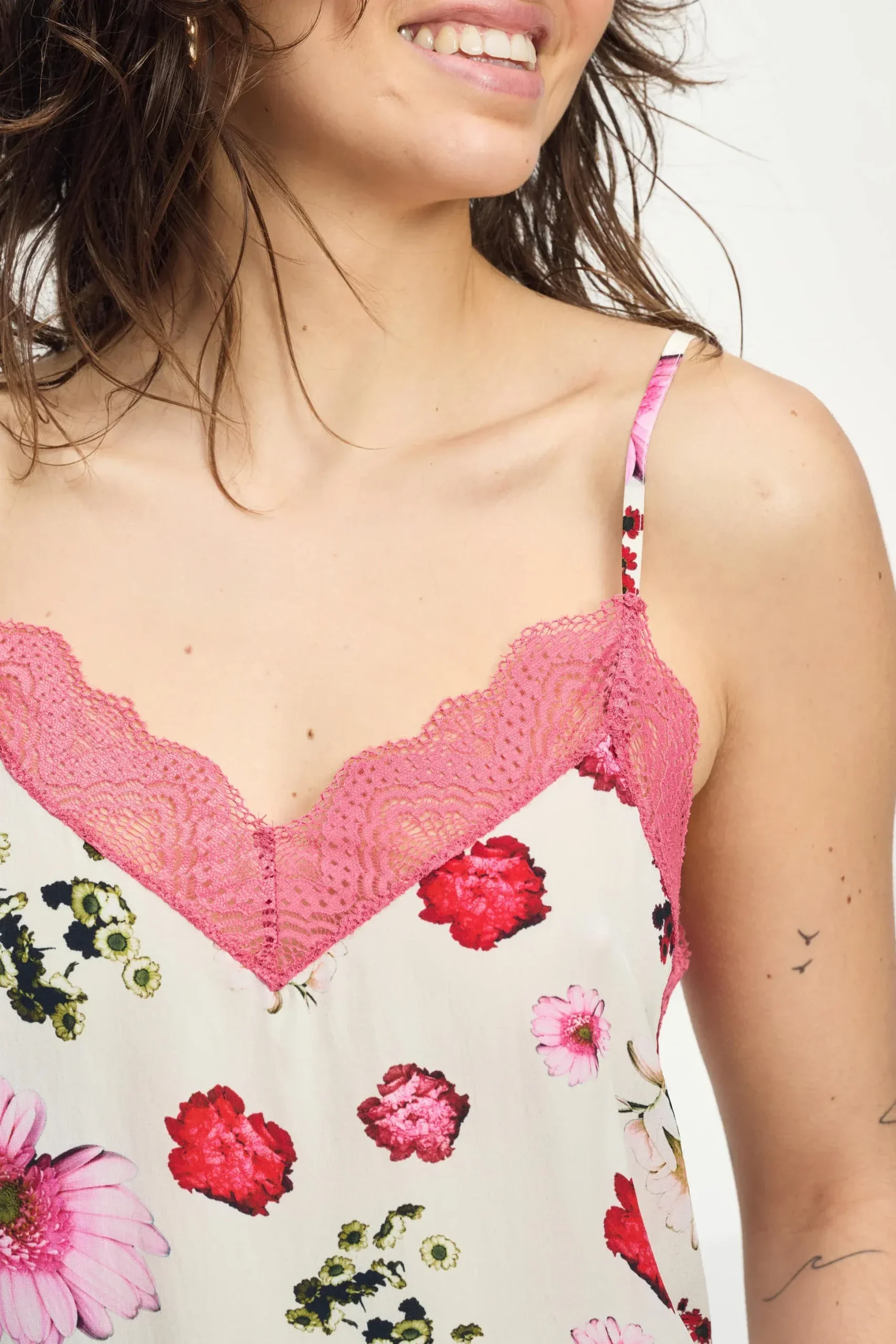 Le Top Cami Bouquet séduit par son imprimé floral délicat et ses finitions raffinées. Confectionné en 100% viscosed’une belle brillance, il apporte un toucher doux et léger, idéal pour les journées ensoleillées. Son encolure en V ornée de dentelle rose et ses bretelles réglables assurent un ajustement parfait et une silhouette gracieuse.