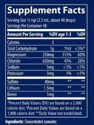 We recommend mixing it with juice or food and dividing the serving throughout the day to mask the concentrated mineral flavour. Begin regimen by taking 10 drops for 3 consecutive days. Each day thereafter, increase serving by 10 drops up to ½ teaspoon (40 drops) once or twice daily.