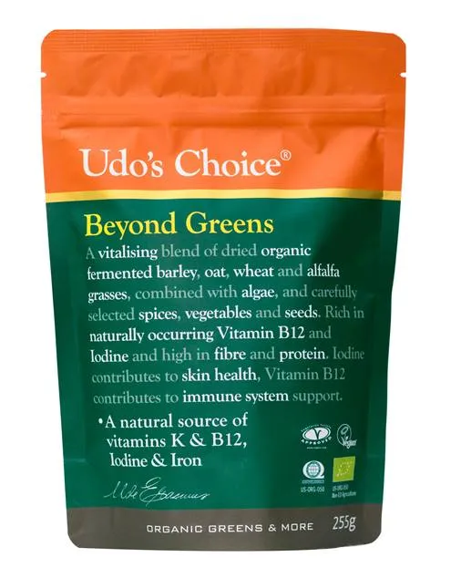 Pulp of defatted: brown flax seed, sunflower seed, sesame seed, oat bran, rice bran, barley grass, golden flax seed (whole), alfalfa grass, cane juice (dried), carrot, Soyforce powdered sprouted soybean, tomato, beet root, oat grass, rye grass, cinnamon bark, ginger root, peppermint leaf, bilberry leaf, spirulina, chlorella, broccoli, parsley, red clover blossom, kale, Udos Choice Ultimate Digestive Enzyme Blend powder (amylase, lipase, protease, cellulase, glucoamylase, invertase, malt diastase, lactase, pectinase (with phytase) and bromelain in a base of beetroot fibre), lemongrass, natural almond flavour, beet juice powder, psyllium husk, artichoke leaf, dandelion root, dandelion leaf, rosemary leaf, thyme herb, grape seed extract. Free of dairy, wheat & yeast.