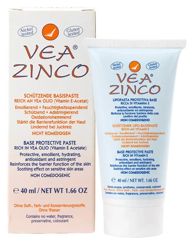 All the actions of VEA LIPOGEL with 30%(micronized) Zinc oxide. A Zinc Oxide paste that also delivers the actions of Vitamin E, providing a protective barrier effect, anti-inflammatory action, reepitheliazation activity and the actions of Zinc Oxide anti-inflammatory, antibacterial action absorbing action and astringent action. Indicated for all areas of cutaneous folds, sweating and reddening.