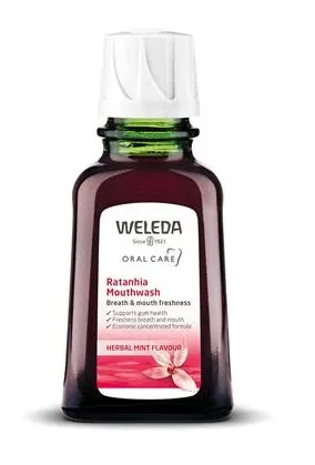 Weleda Ratanhia Mouthwash is a unique concentrate made of plant extracts of ratanhia and myrrh, which are known for their toning, astringent and soothing properties. Pure essential oils of sage, eucalyptus and peppermint provide freshness. Daily use reduces bad breath and helps tightens the gums. Contains calcium fluoride.