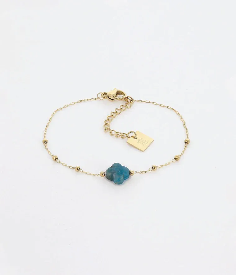 Bracelet en acier inoxydable chaîne « chapelet » sur lequel est attachée une pierre naturelle facettée en forme de trèfle.