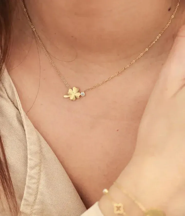 Magnifique collier orné d’un trèfle accompagné d’un cristal blanc en serti clos.